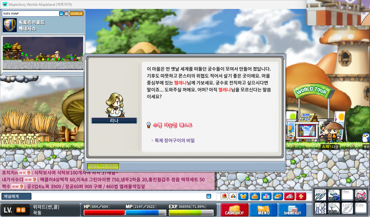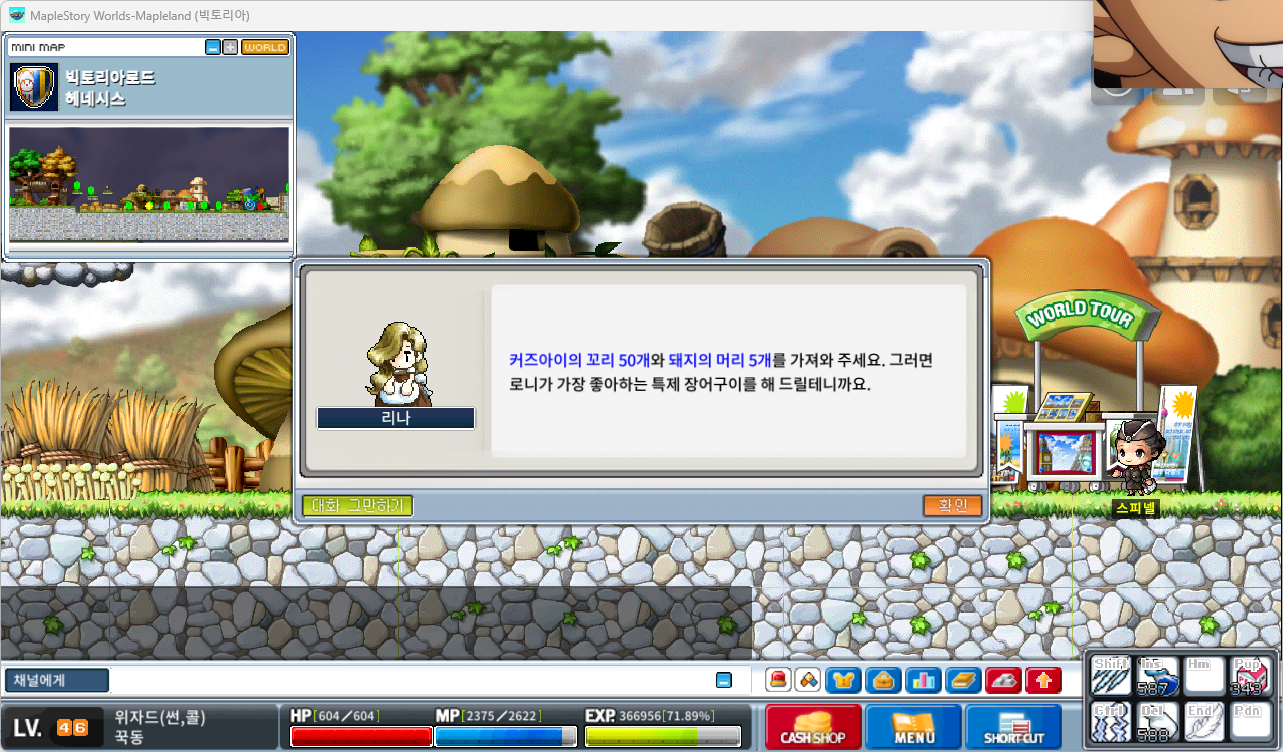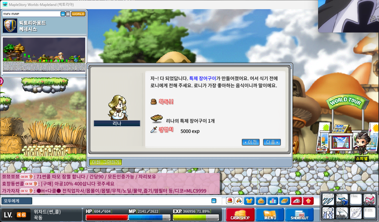 남자캐릭이기에 파란색 가운과 경험치 5000에 메소까지 받으면 완료